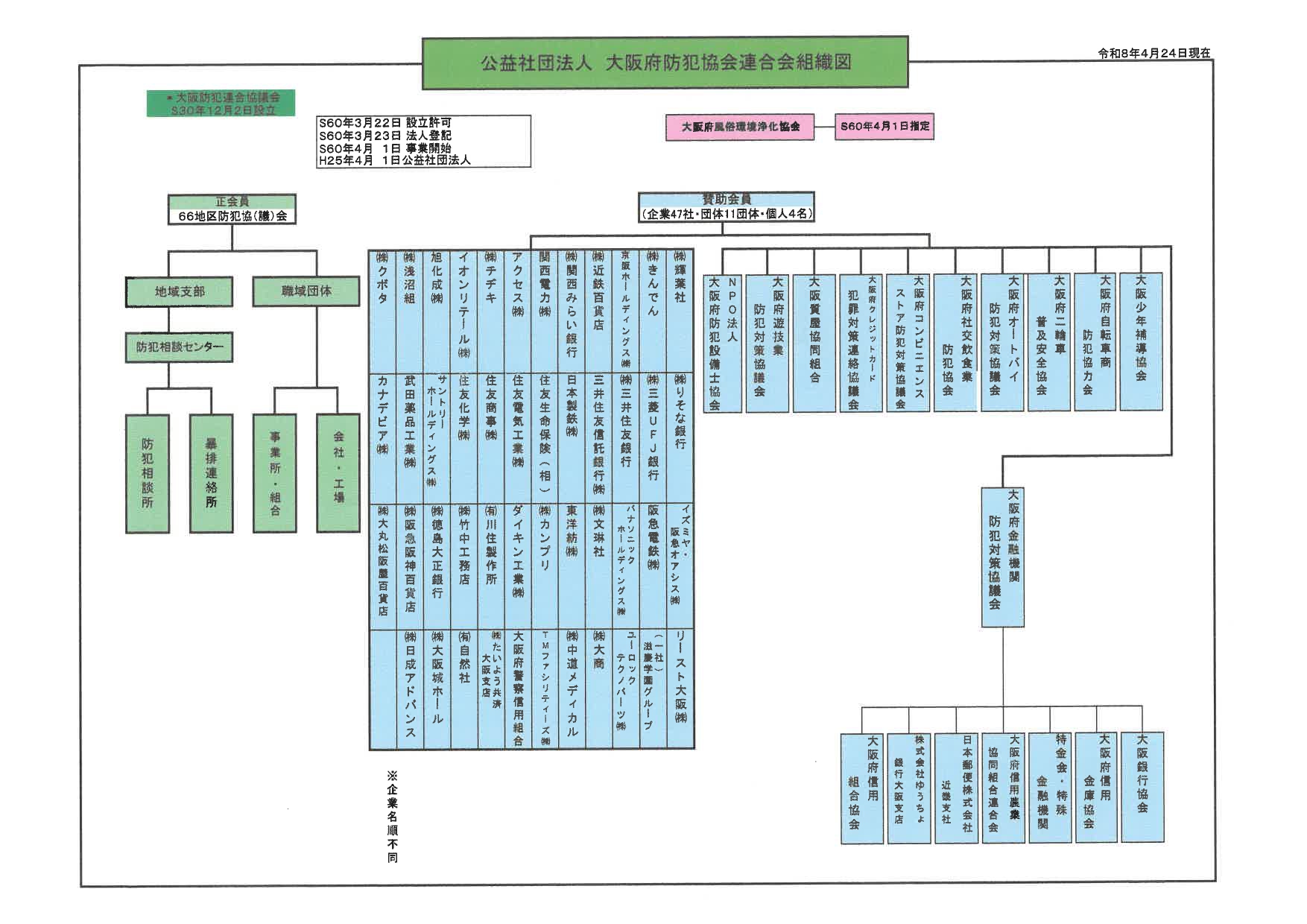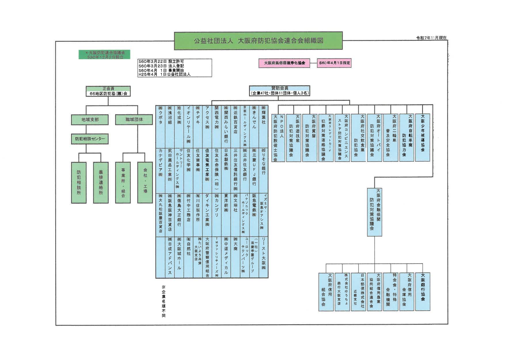| 会 員 | 本会の会員は、次のとおりです。 (1) 正会員 本会の目的に賛同して入会した大阪府内の防犯団体 (2) 賛助会員 本会の目的に賛同し、事業の推進を援助するため入会した個人又は団体 (3) 大防連組織図(PDF) |