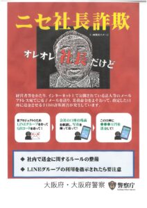 ニセ社長詐欺に注意! 2026.02.06 ここ最近、全国的に『ニセ社長詐欺』の被害が多数確認されています 『ニセ社長詐欺』は、経営者や会社の同僚等をかたって法人や社員個人のメールアドレス宛に電子メールを送り、業務連絡を装って指定口座へ送金させ金銭をだまし取る手口です また、政治家や政治家秘書を騙ってSNSでのやり取りを求めて金銭等を要求する手口も確認されています LINEグループなどのSNS利用を指示された場合は特に注意して、被害にあわないように気を付けてください 賛助会員定例会を開催