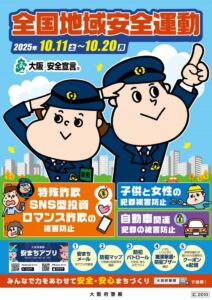 全国地域安全運動を実施します 2025.09.30 今年も 10月11日(土)から20日(月)までの10日間、 全国地域安全運動 を実施します 『みんなで力をあわせて安全・安心まちづくり』 をメインスローガンに ①特殊詐欺、SNS型投資・ロマンス詐欺の被害防止 ②子供と女性の犯罪被害防止 ③自動車関連犯罪の被害防止 にむけた集中的な活動を実施していきます ニセ警察詐欺に注意 全国地域安全運動大阪府民大会を開催しました