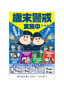 歳末警戒実施中 2025.12.01 年末はなにかとあわただしくなり、身の回りの防犯対策がおろそかになりがちです 地域ぐるみで自主防犯意識を高め、事件や事故にあわないように注意し、平穏な新年を迎えましょう 大阪府下の防犯協(議)会では、所轄の警察署と連携しながら、それぞれの地域の実情に応じた歳末警戒活動を実施しています 全国地域安全運動大阪府民大会を開催しました